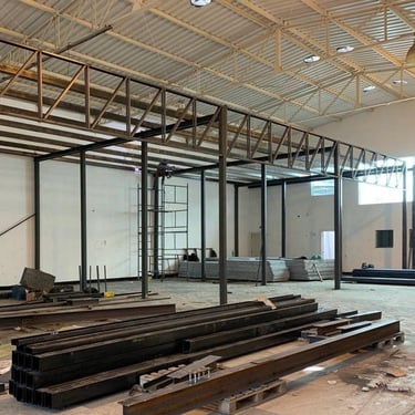 Para otimizar o espaço, foi executado um mezanino em estrutura metálica robusta, dobrando a área útil e atendendo às demandas operacionais e de comunicação visual da marca.